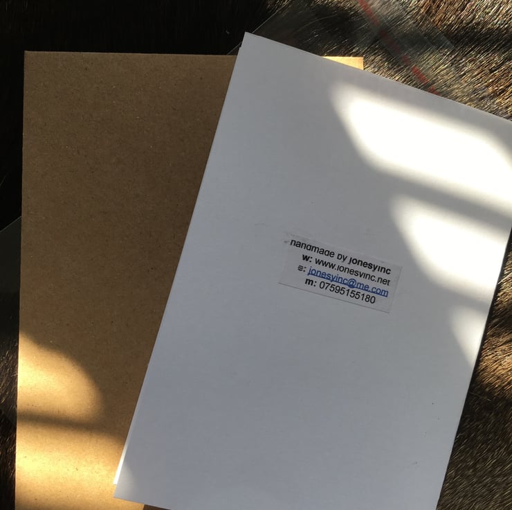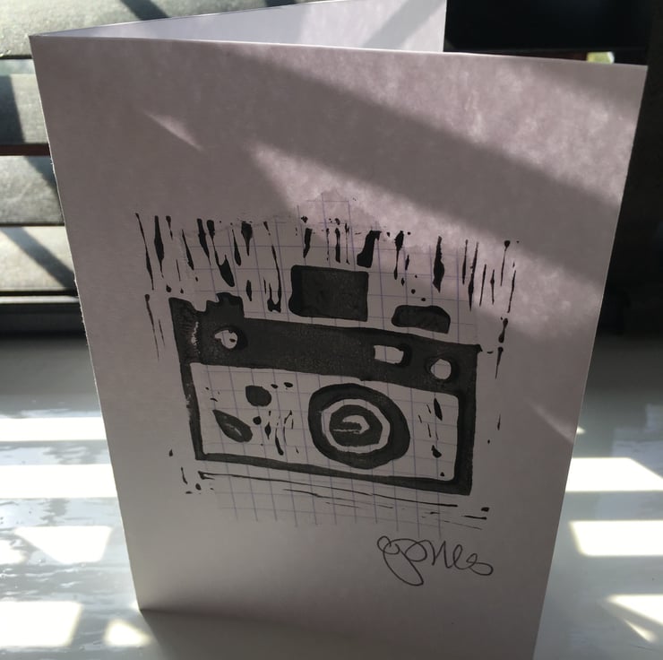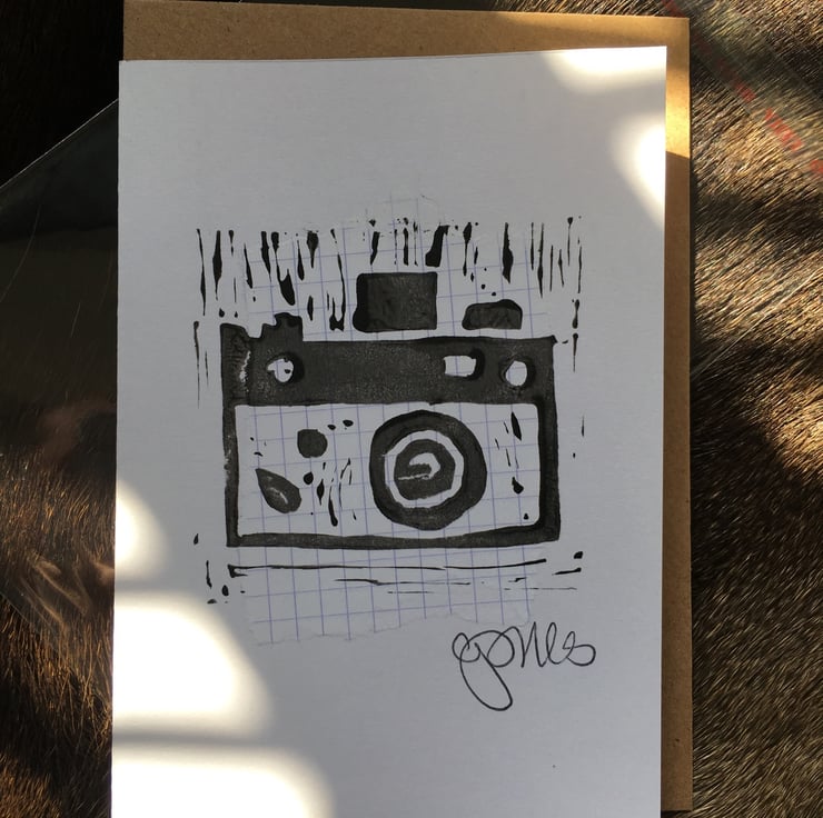 Handmade card, using a handout lino image of a camera, handprinted on a torn paper collage. Card size is approx A6. Each card is individually poly bagged, and comes on either a plain white, french graph or brown card stock, with either a brown or white envelope.