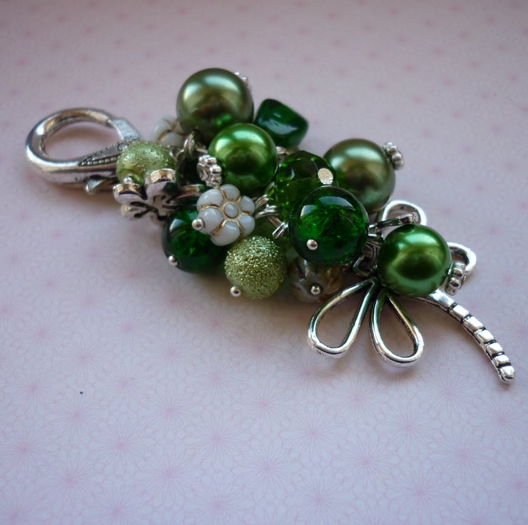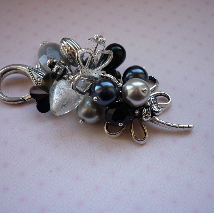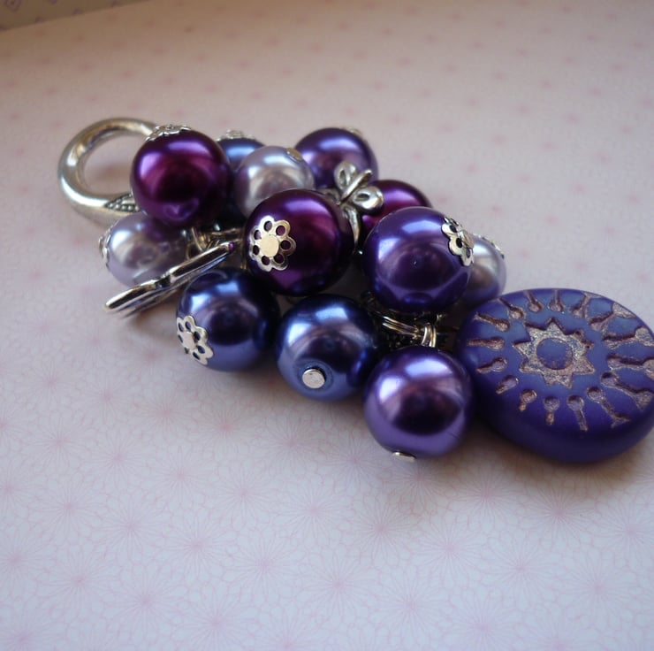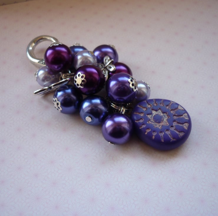 THE HANDBAG CHARM HAS BEEN MADE USING A SINGLE POLYMER CLAY CHARM IN PURPLE ALONG WITH A SELECTION OF GLASS BEADS IN SHADES OF PURPLE, MAGENTA AND LILAC, SILVER PLATED CHARMS AND FINISHED WITH A LARGE FANCY SINGLE LOBSTER CLASP.