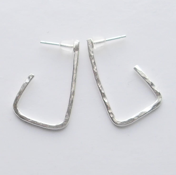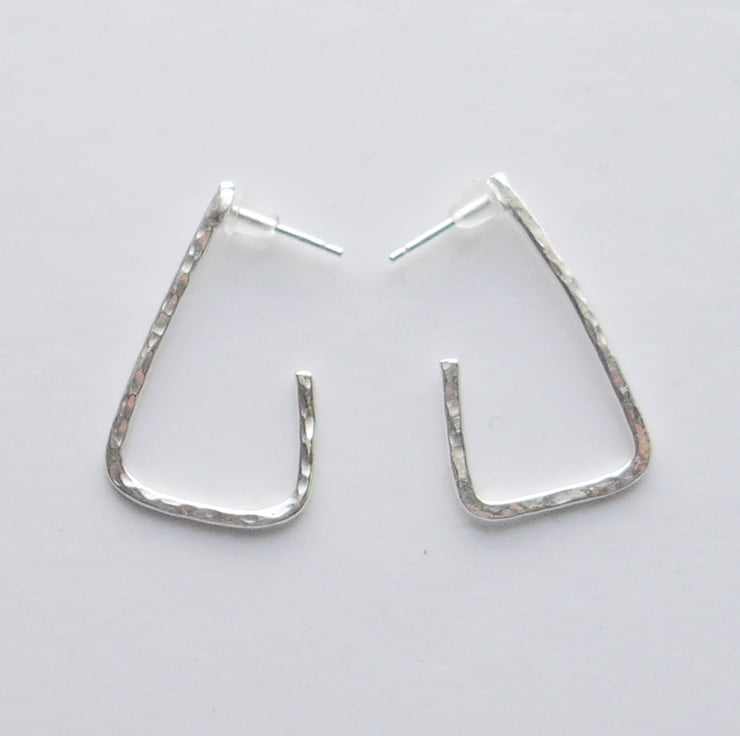These beautiful earrings are hand made from hammered sterling silver with a hand soldered sterling silver stud. The earring backs are rubber.