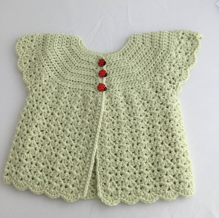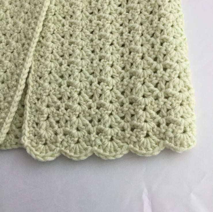 Cardigan fits 18" (46cm) chest actual size 20" (51cm) length from shoulder to bottom of scallop border 11" (28cm) will fit well over T-shirts, thin jumpers and dresses