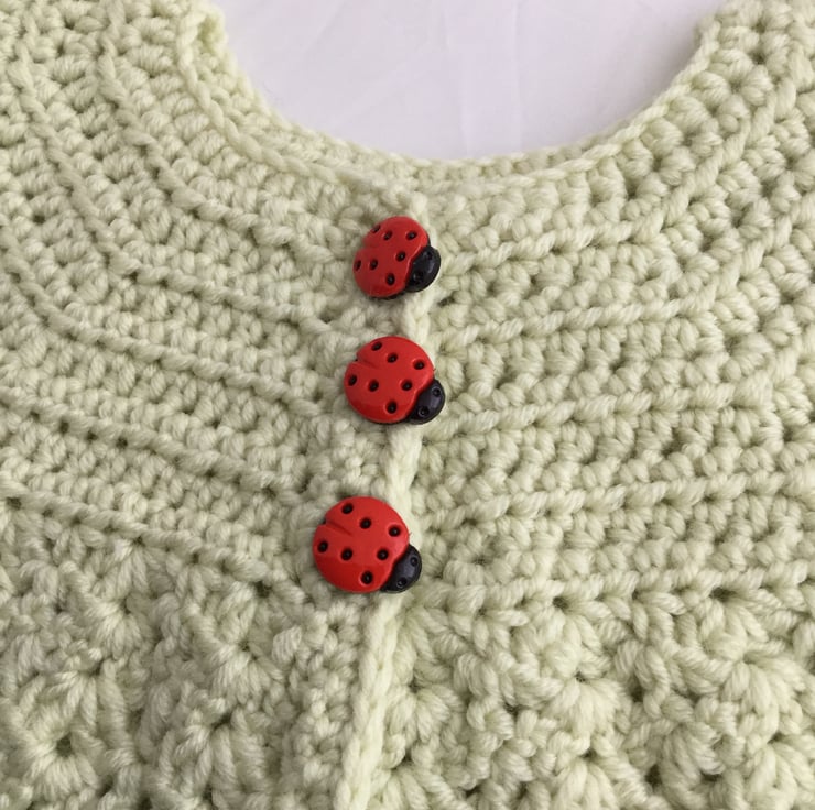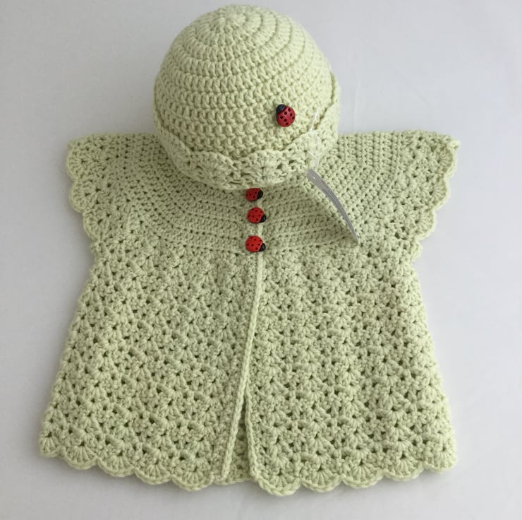 I have crocheted this pretty set in pale green Debbie Bliss Rialto yarn and added cute ladybird buttons to both.
