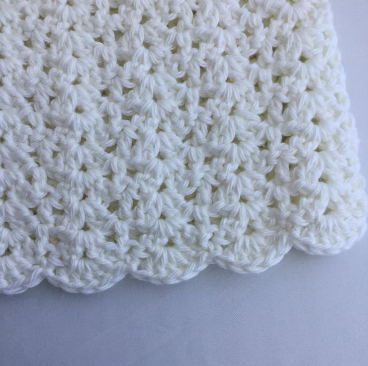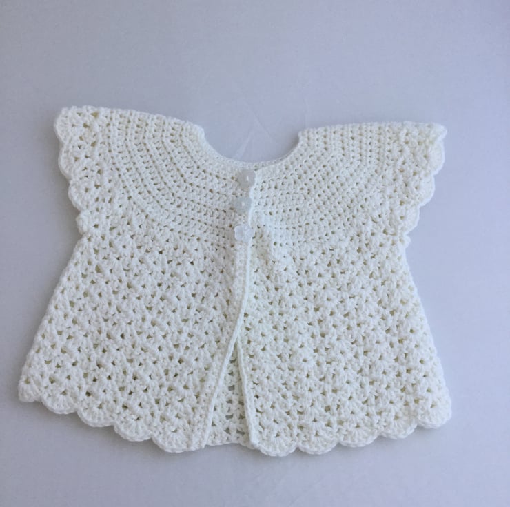 Cardigan fits 18" (46cm) chest actual size 20" (51cm) length from shoulder to bottom of scallop edge 11" (28cm)