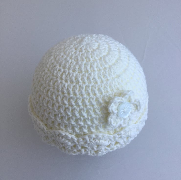 I have crocheted this cute little set in cream baby cotton DK yarn by Sirdar finished with 3 flower buttons on the cardigan and crocheted flower and button on the hat.