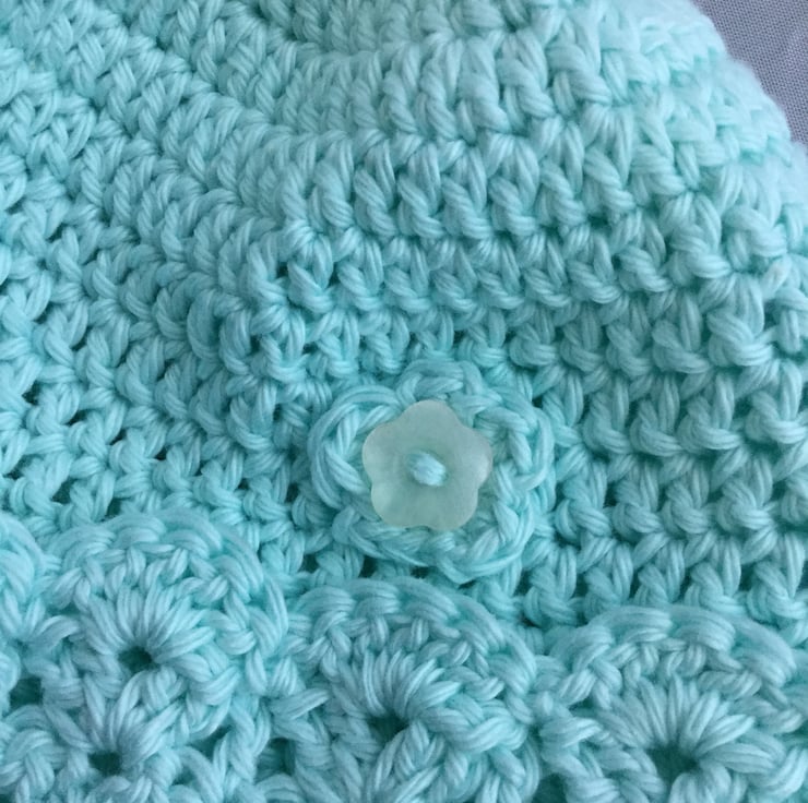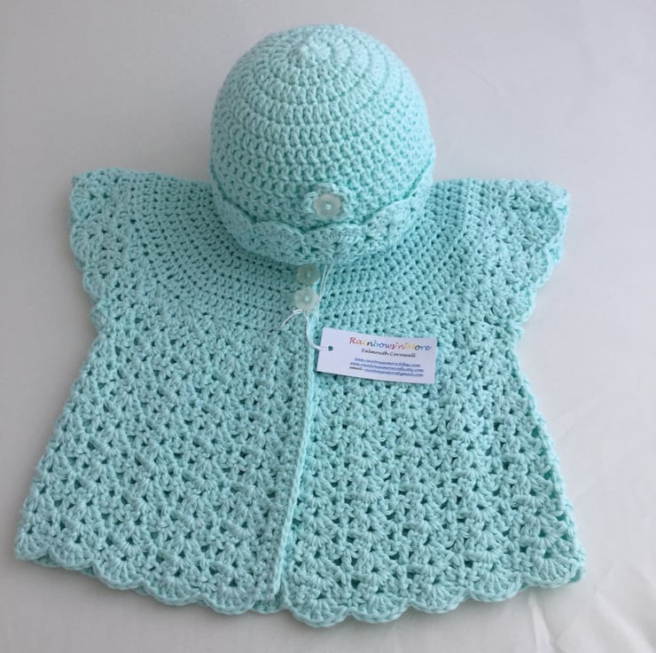 This delightful set has been crocheted in a mint baby cotton DK yarn by Sirdar, it has been finished with 3 flower buttons on the cardigan and a crocheted flower and button on the hat.