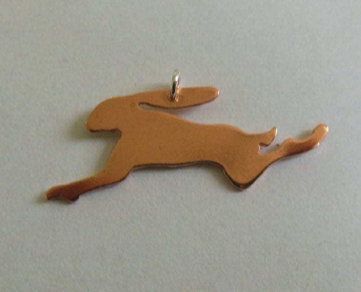 The hares are cut by hand from sheet copper with a piercing saw , all of the connections and the chain are Sterling silver.