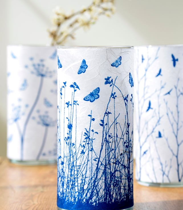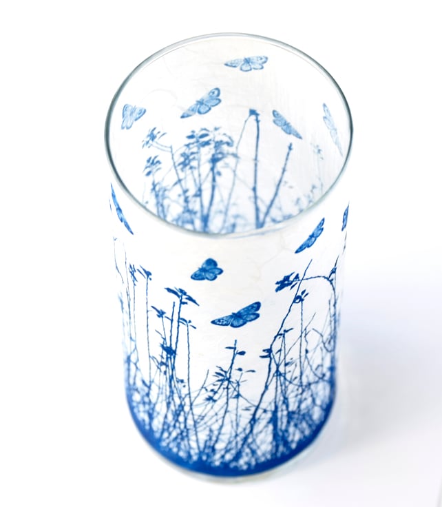A large cylinder vase with semi translucent blue butterflies fluttering above a meadow. Created using the Cyanotype technique on a textured paper then applied to glass.