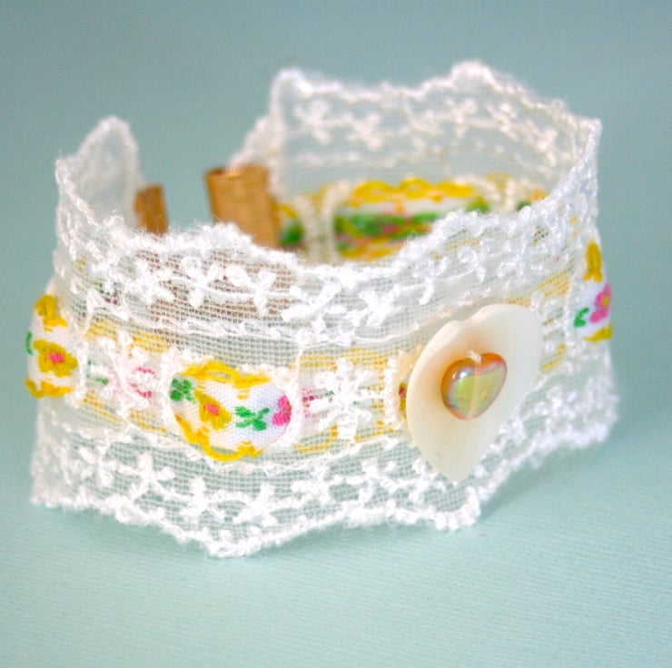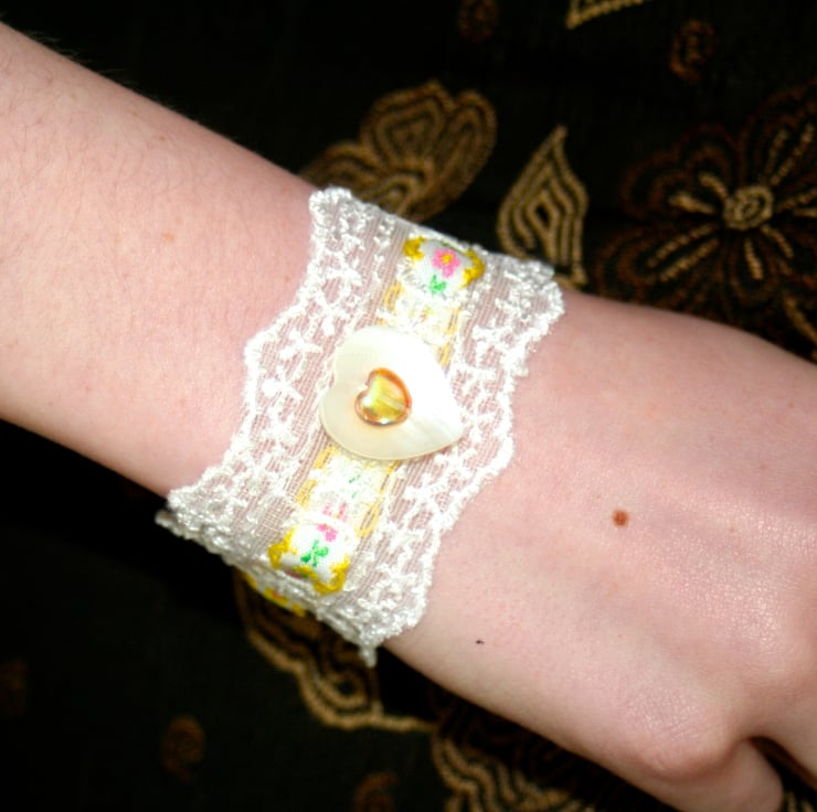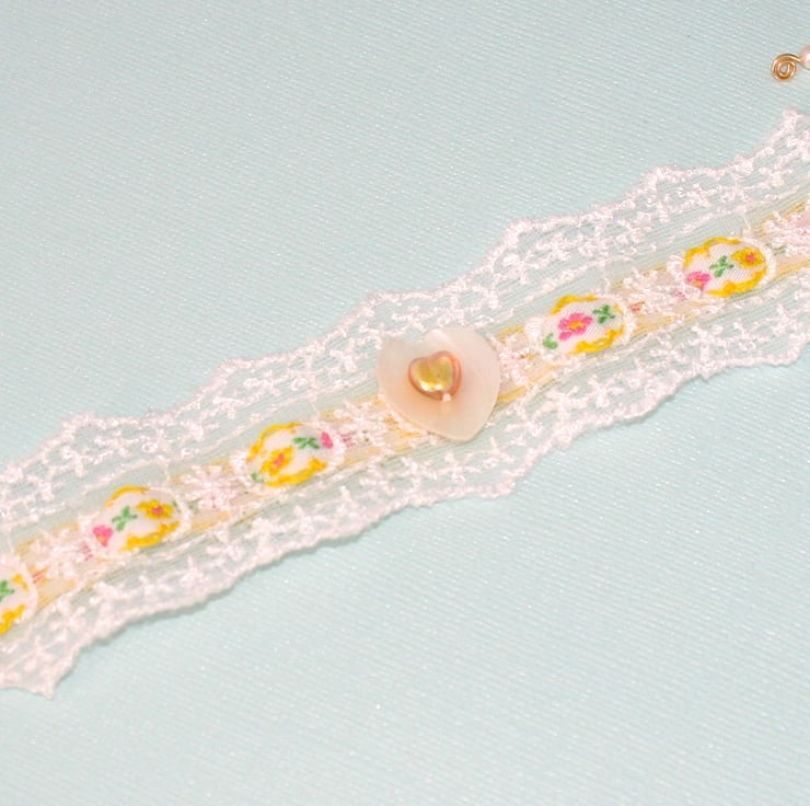 A very pretty lace cuff interweaved with a gorgeous spring patterned yellow scalloped edged ribbon. A cream coloured shell heart button and yellow glass heart bead are sewn onto the centre of the bracelet. The ends are finished with gold plated, textured ribbon ends and a lobster claw clasp.