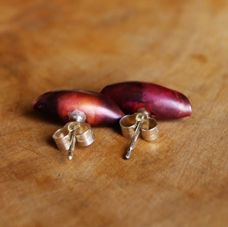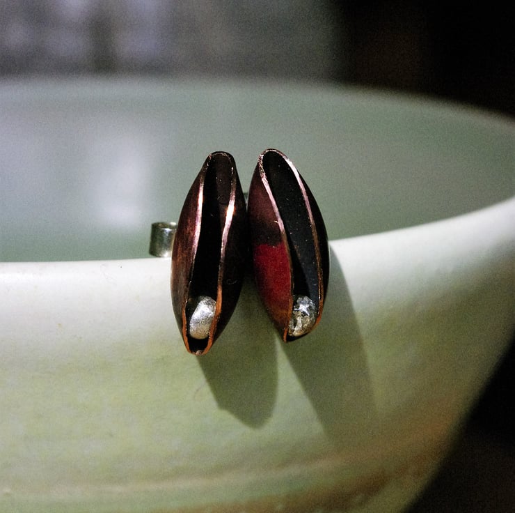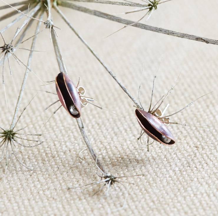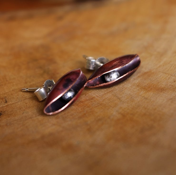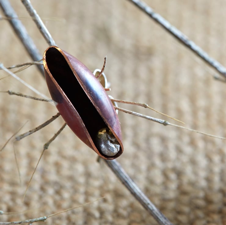 Copper pod with silver 'seed' inside. I haven't soldered the seed to the inside; it moves up and down freely without falling out. The pod measures 15mm long.