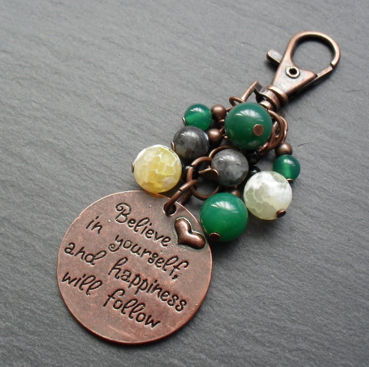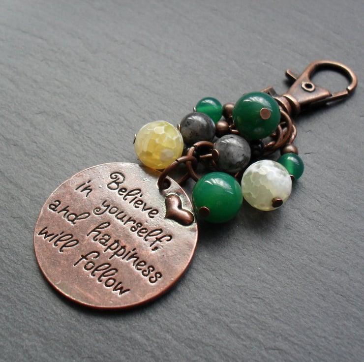 Discontinued, Antique copper bag charm with Semi precious gemstones of green, yellow and black agate and larvikite which are attached to a antique copper tone clasp