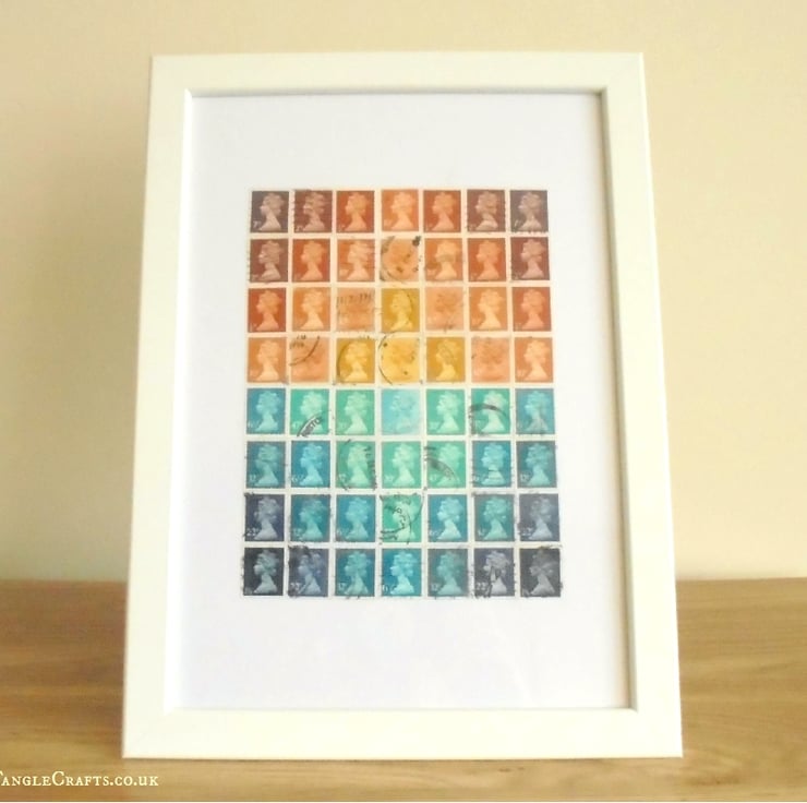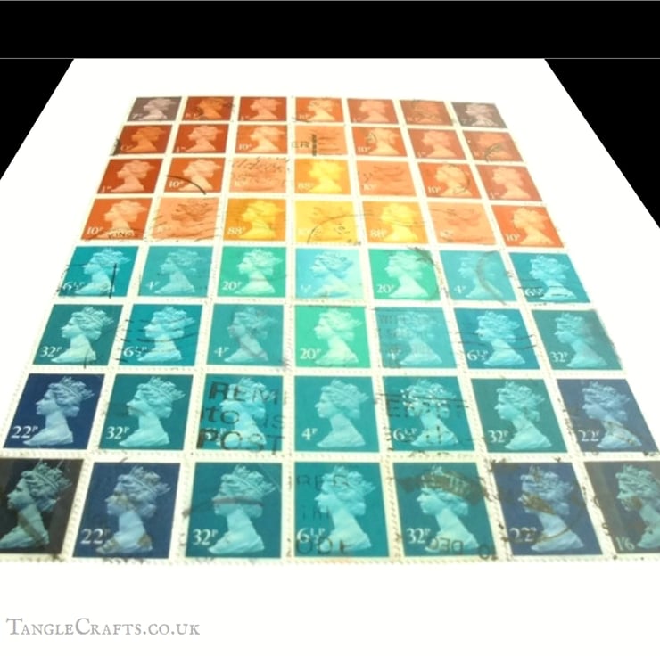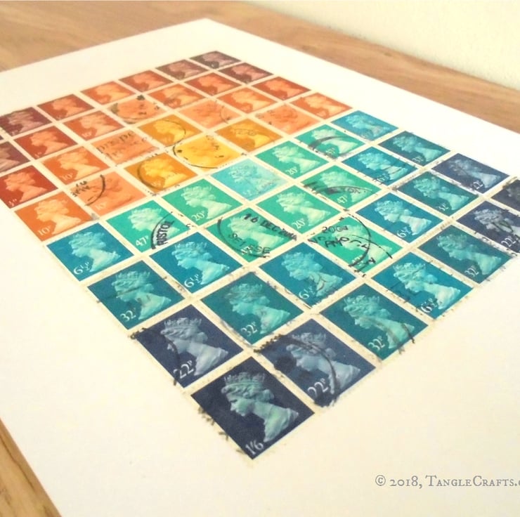This design is a re-creation of my 'signature' Sunset at Sea pattern. In this interpretation, the mosaic-style design uses only the classic British Machin-design postage stamps, in 12 different colours/denominations (which date from the 1960s through to the 1990s). The stamps still bear fragments of postmarks and other cancellation marks as a testament to their former active service for the Royal Mail, ensuring that each artwork has its own 'personality'.