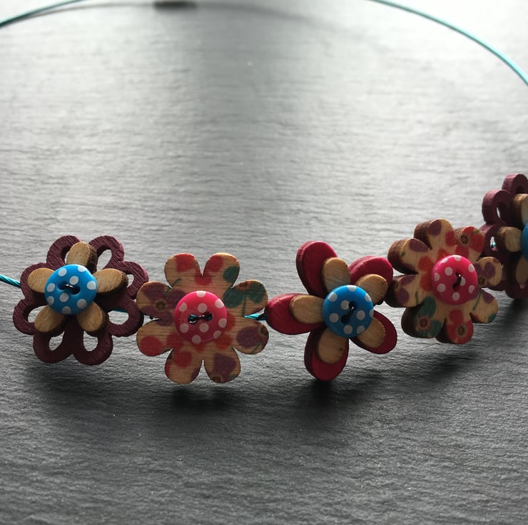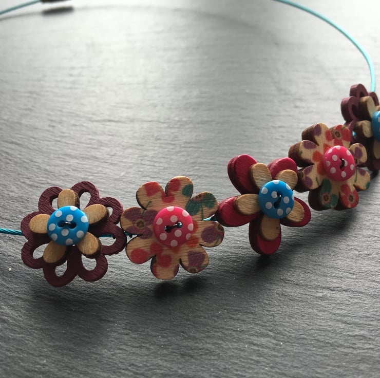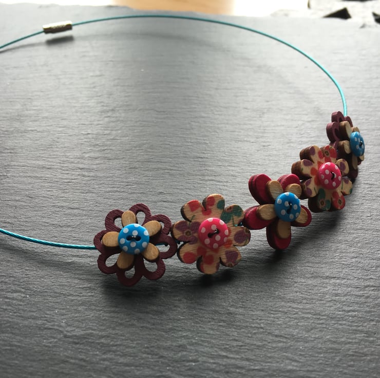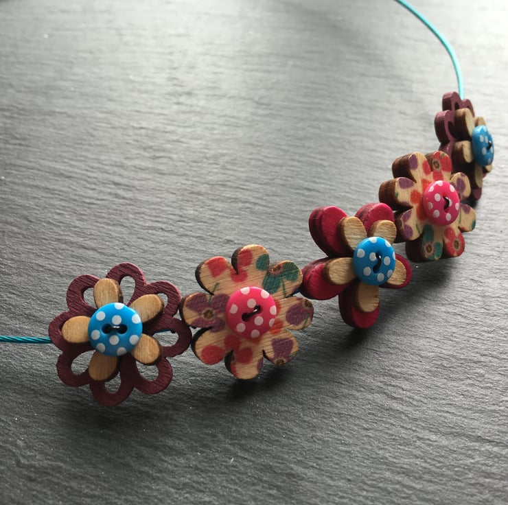 A gorgeous combination of layered wooden laser cut floral buttons dyed in vibrant jewel shades and finished with tiny polkadot micro buttons have been interspersed with decorated floral buttons in gorgeous shades of aqua, pinks and purples to create this unique button necklace.