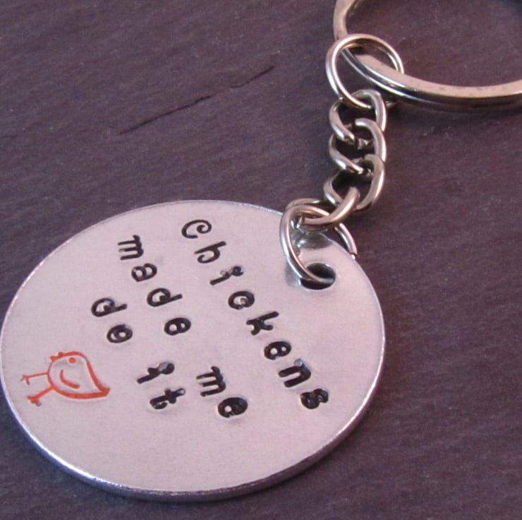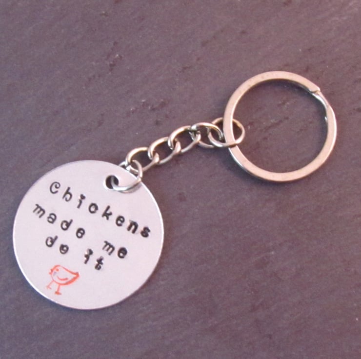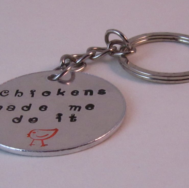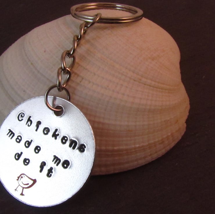This is a fun Chickens made me do it keyring. It is created by hand stamping onto high grade aluminium. A great gift for any Robert Rankin fan, or for those who just like chickens.
