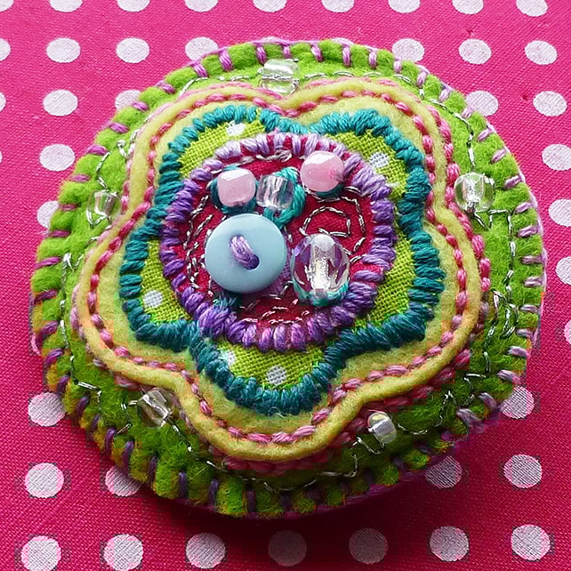 It is made from layers of cotton and felt, embellished with a light blue button, pink and clear beads, and embroidered stitching. This colourful round brooch has a flower design and has been finished off with a silver-toned brooch back on the reverse.