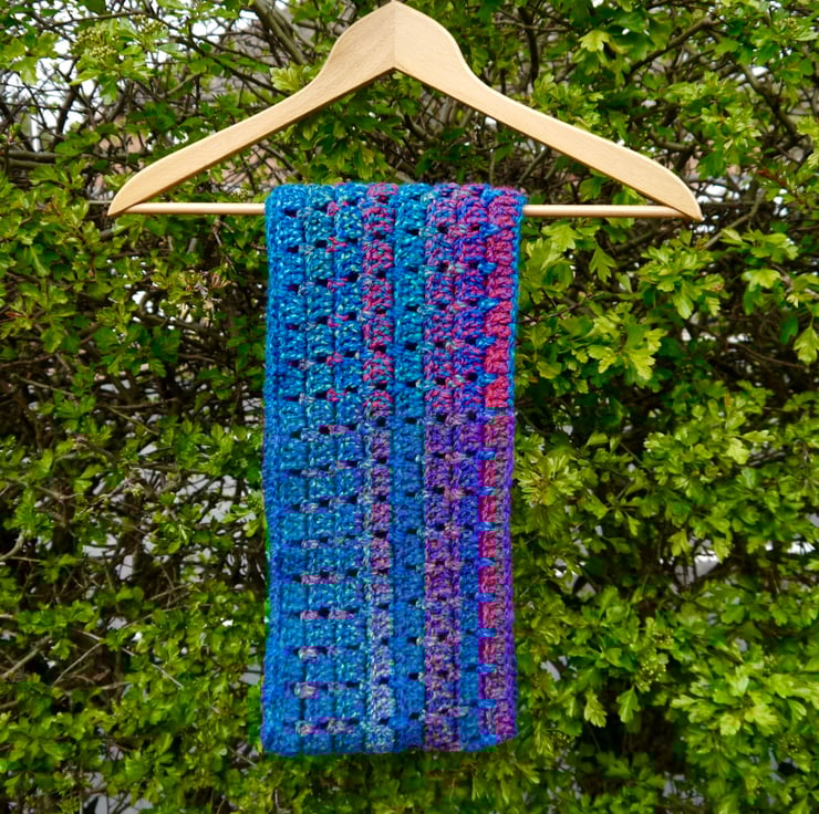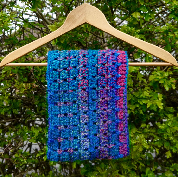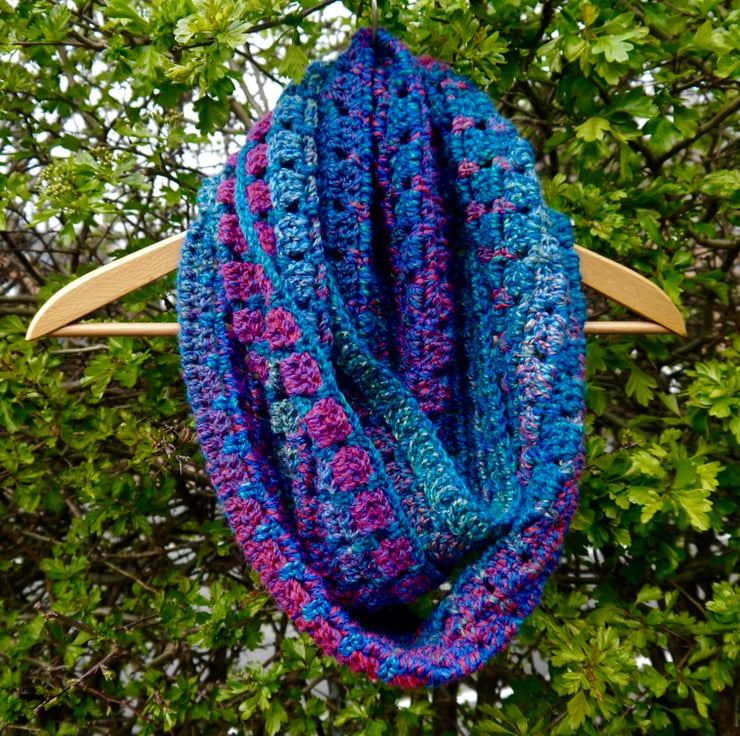 A lovely, warm and cosy infinity scarf perfect for cold winter days and cool spring ones too. Hand crocheted using marbled chunky wool in jewel colours. Can be looped once or twice around neck.