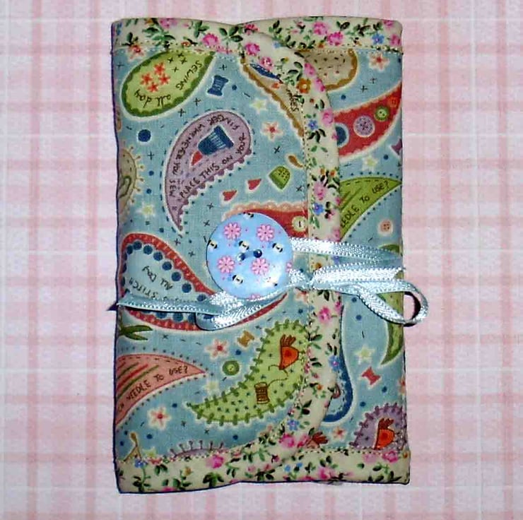 This sewing set combines a needle case with space to store you scissors, unpicker etc. It comes complete with a tape measure and mini sewing set as shown in photo, and has space for scissors etc. and flannel leaves for your pins and needles. It fastens with a ribbon to tie around the pretty button. It measures approx. 9.5 x5.5 inches when opened (see second photo) and 3.5 x5.5 inches when closed.