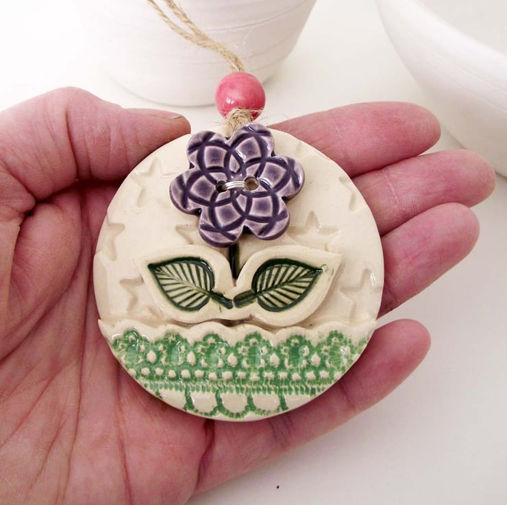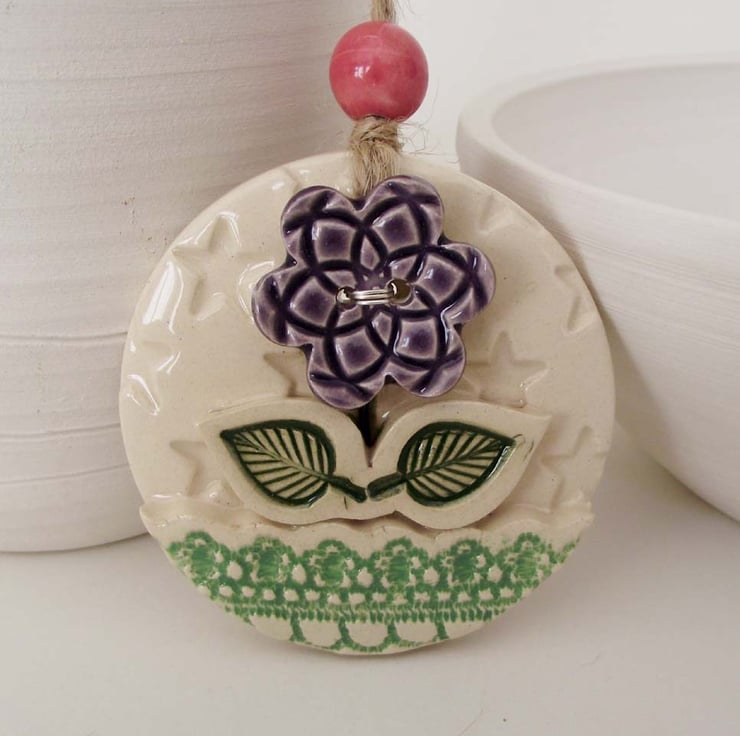 This cute little hanging decoration has been made from white earthenware clay and imprinted with pattern.