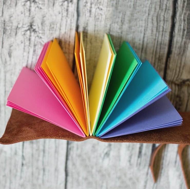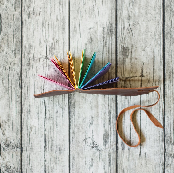 Six gorgeous and carefully selected bold shades (pink, orange, yellow, green, blue and purple) blend together beautifully to create these bold rainbow pages. Bound into your choice of leather.
