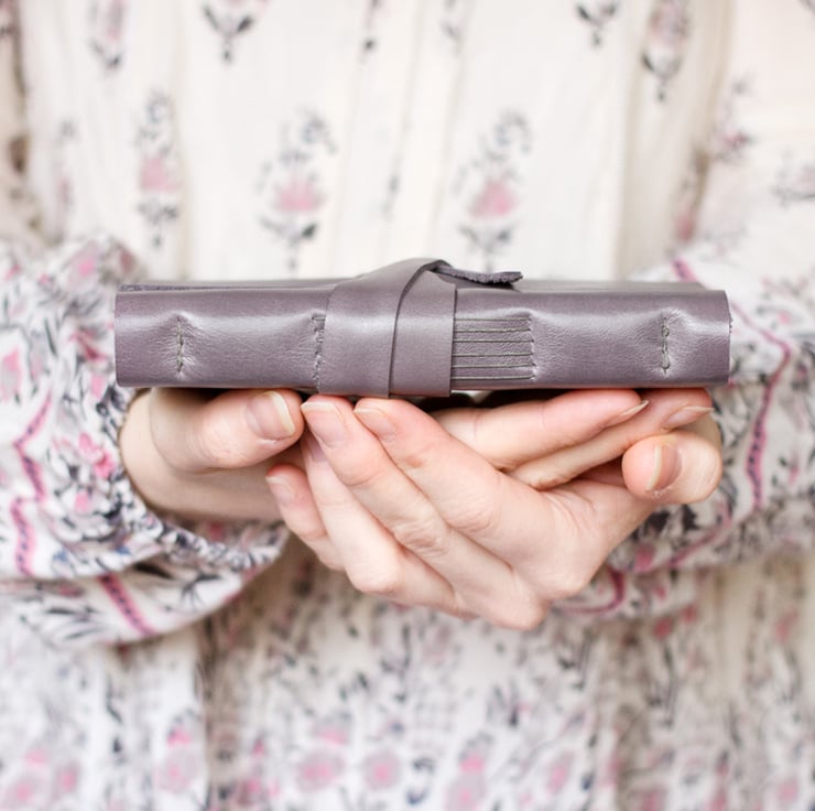 Perfect for on the move, 120 page A6 journal hand-bound into beautifully soft leather. It secures using a slither of leather attached to the cover flap which wraps around the journal and tucks in neatly to keep your work safe and sound.