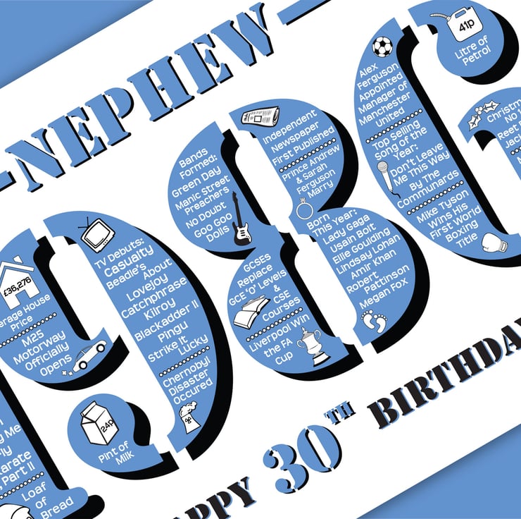Happy 30th Birthday Nephew Greetings Card - Year of Birth - Born in 1986 Facts
