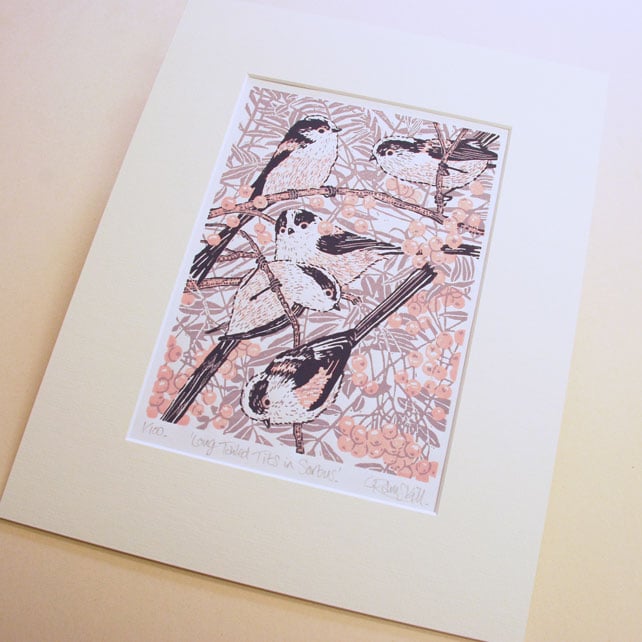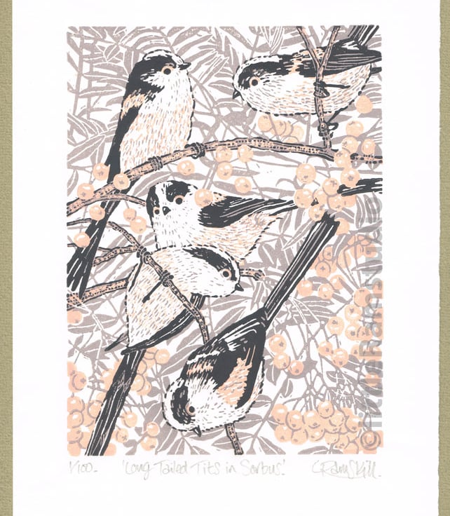 The Sorbus tree is a specimen tree in a friends garden, Gary noticed the colour of the berries was such a match for the pink of the Long Tailed Tit he just had to bring them together in this charming print.