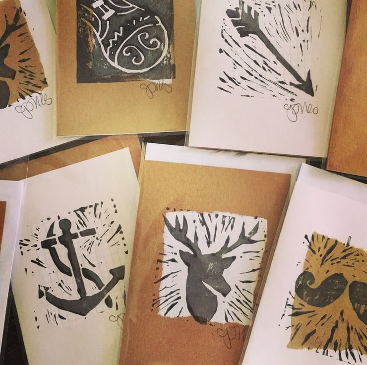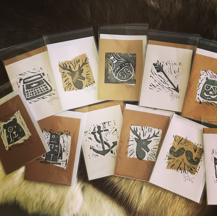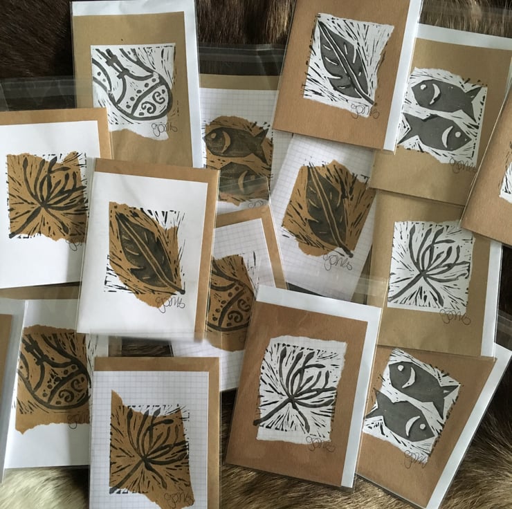 Handmade cards with a handout lino image, handprinted on a torn paper collage. Card size is approx A6. Each card is individually poly bagged, and comes on either a plain white, french graph or brown card stock, with either a brown or white envelope.
