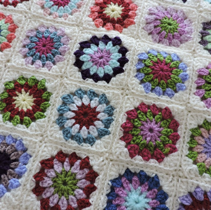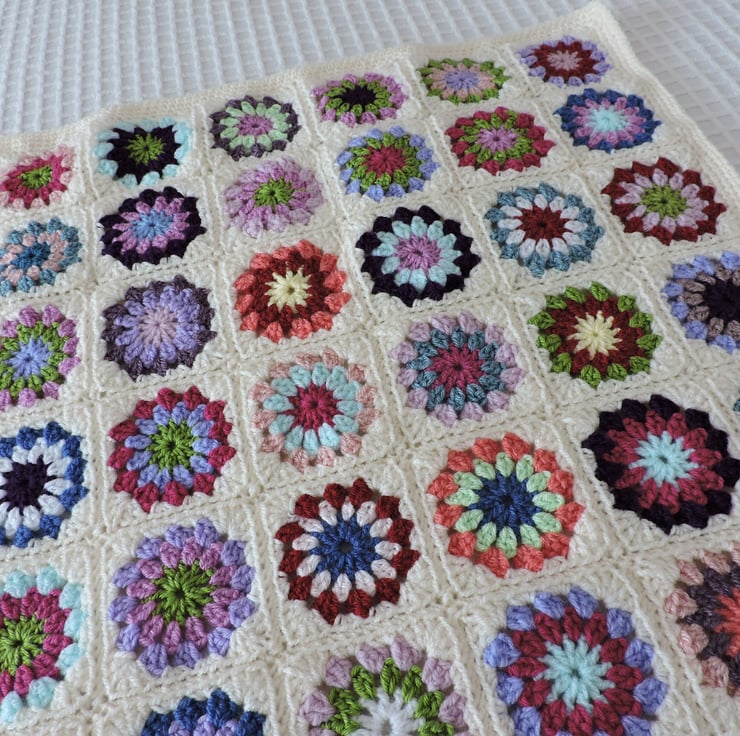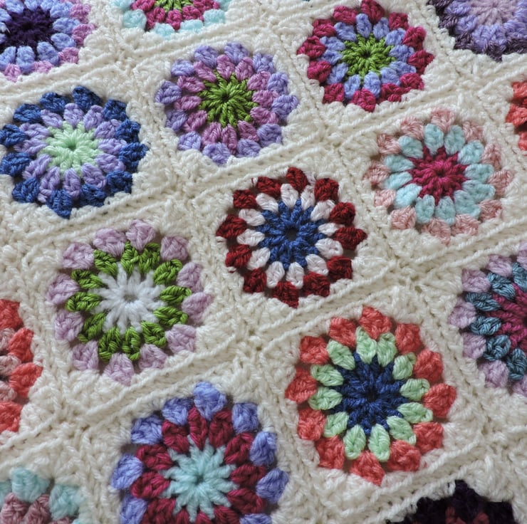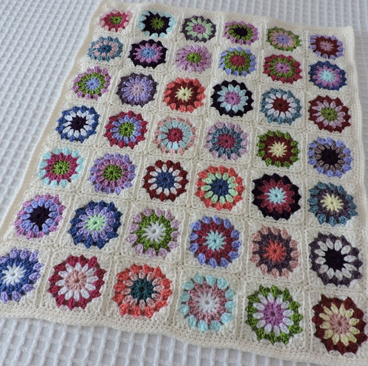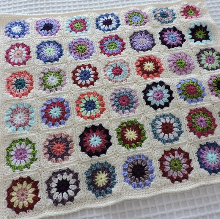 I've crocheted this pretty baby blanket in a rainbow of double knit yarn colours. The little rosettes are of three colours each and edged in cream. The blanket is finished with a plain cream edging.