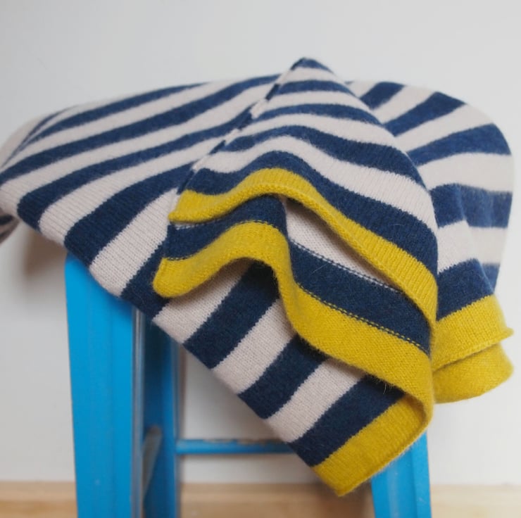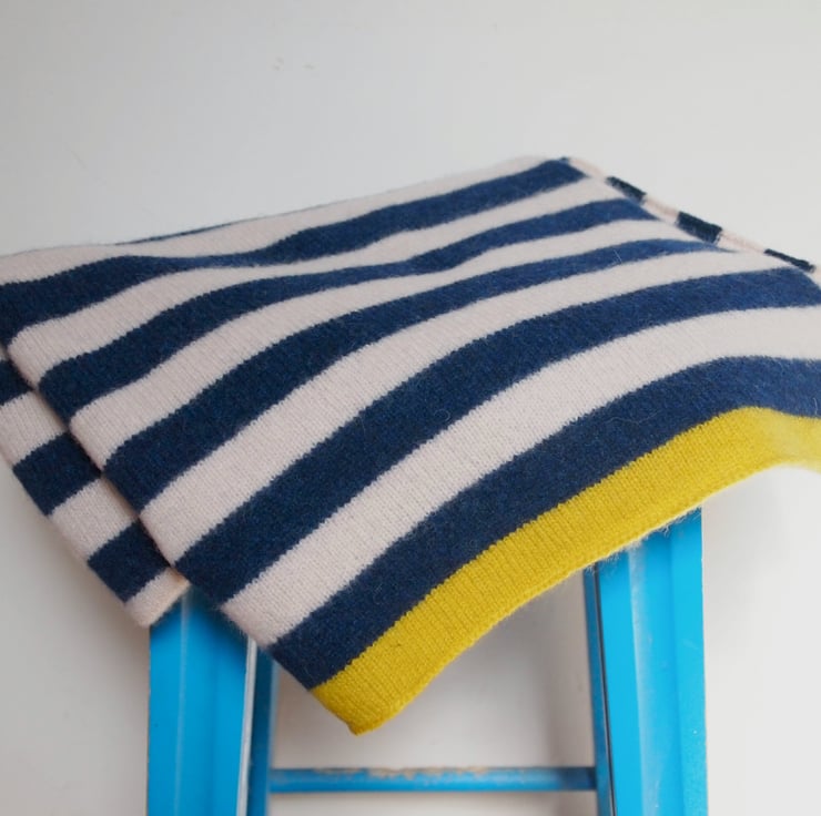It is nice and light so can be used all year round, colours are navy and off white stripes with a golden yellow stripe each end.