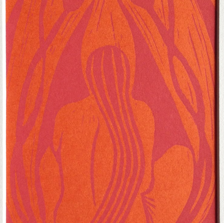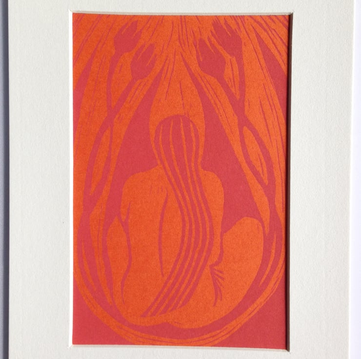This print was inspired by my interest in Art Nouveau, with it's sensuous, flowing curves and focus on nature. My aim was to create a simple, bold image combining the female form with leaves and flowers. In this case, I used pink ink on a clashing orange background to create an eye-catching image.