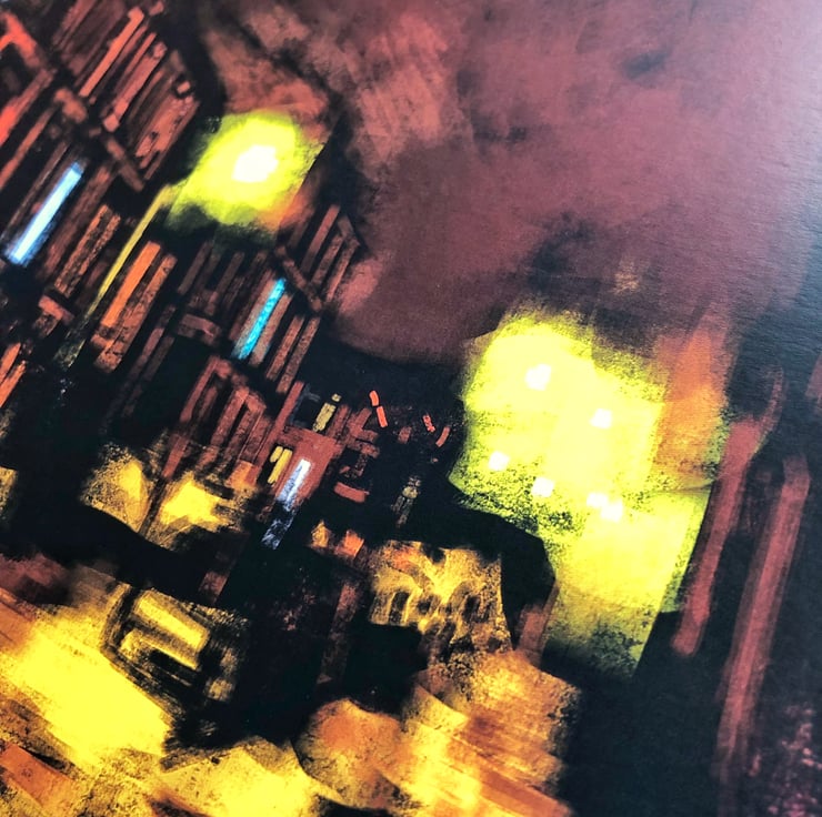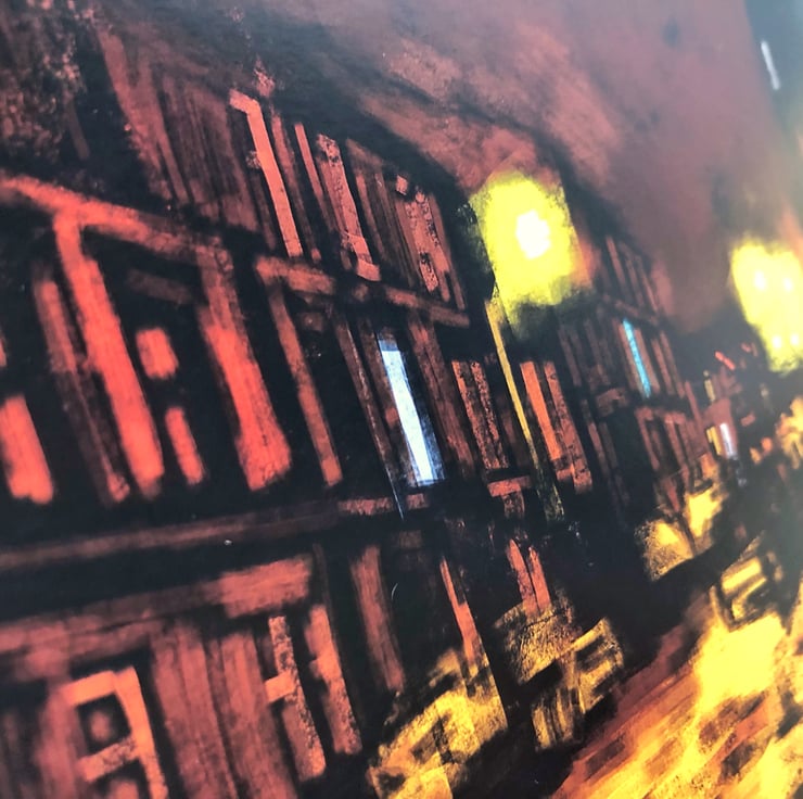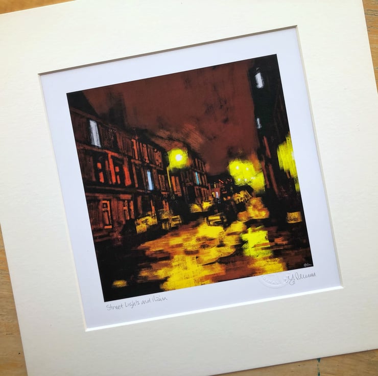 To recreate the cold, dreich, street lit night, I’ve used just a few colour mixes of yellows, ochres and browns.
