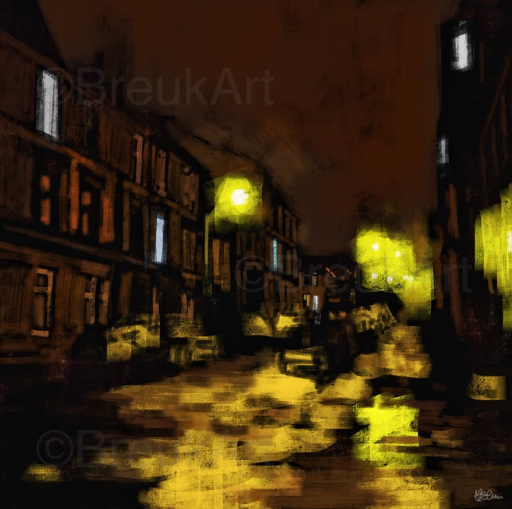 There's a constant drizzle of rain and the yellow glow of the sodium street lights reflect onto the pavements, roads and tenements. Cars are parked up for the night. Most are in bed except for a brave few who’s windows stream the flickering shades of some TV show.