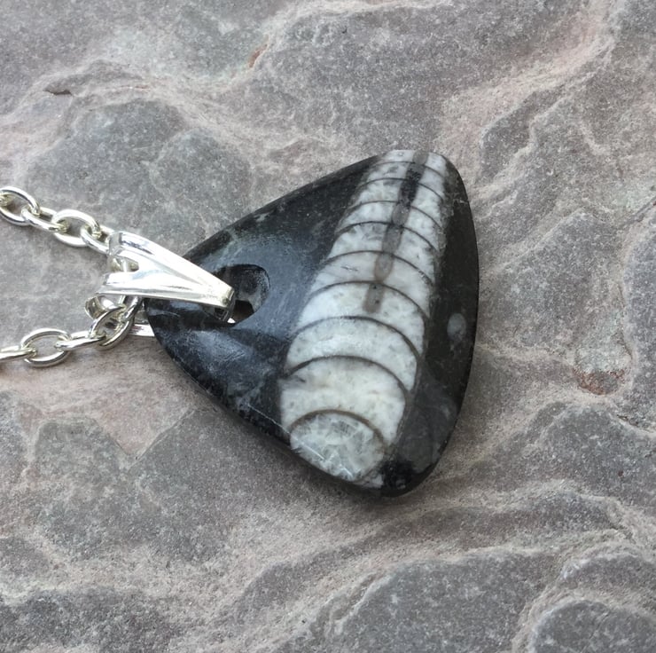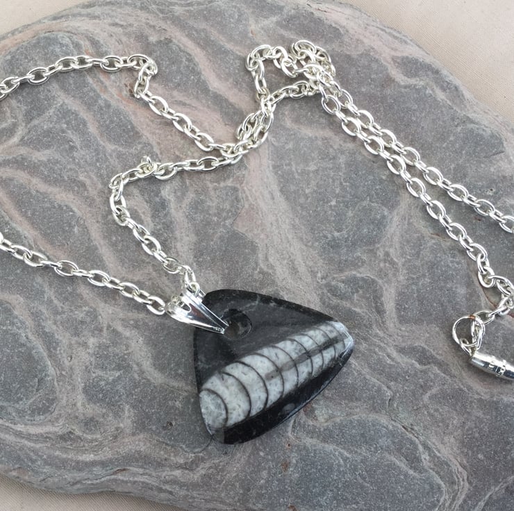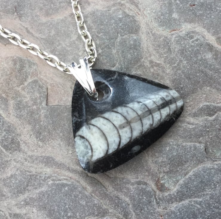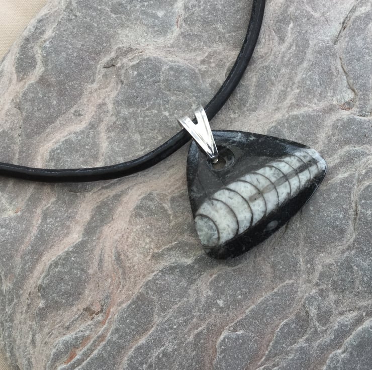 This unique pendant features a fossil of Orthoceras, a genus of extinct cephalopod related to modern squid. They are found in many sedimentary rocks, most frequently limestone, and may date from the Ordovician period about 450 million years ago. Its name means 'straight horn', a reference to the long extension in front of its head. The pendant measures 4x3cm and is highly polished. It has been fitted with a large sterling silver double bail, stamped '925', and is suspended from an 18 inch sterling silver snake chain.