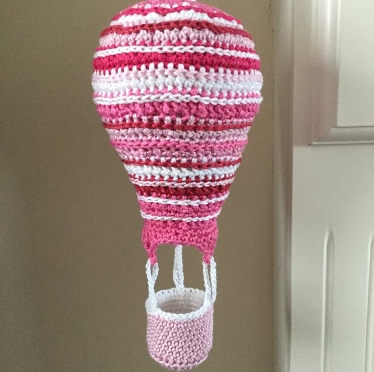 I have crocheted this pretty decoration in 100% cotton yarn using white and 4 shades of pink it is hanging from a pink and white gingham ribbon, The balloon is lightly stuffed with Habico toy stuffing please see photo for information details.