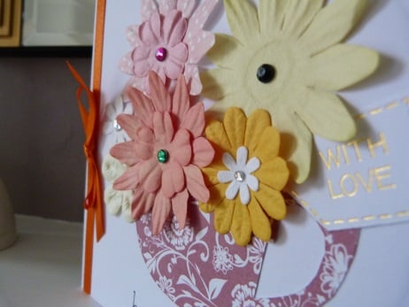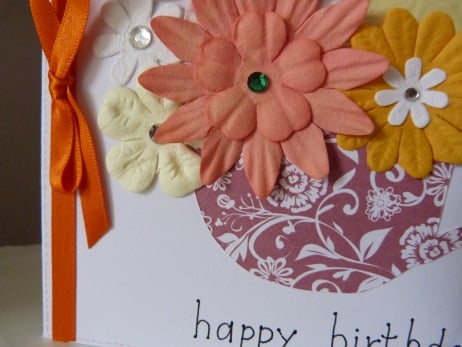 A completely handmade and individually designed card. Consisting of a cup hand cut from floral paper. Filled with assorted die cut paper flowers in pastel shades with rhinestone centres. Mounted onto pristine white quality white card. Finished off with with love tag, handwritten happy birthday in black ink and an orange ribbon and bow.