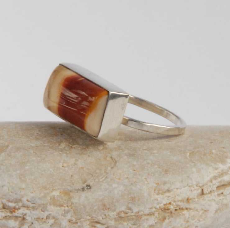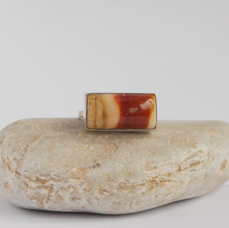 This sterling silver ring features an oblong bezel set mookaite stone mounted on a slim textured band. Mookaite is a jasper from Australia and the cream, red, beige, mustard tones it shows remind me of the outback or the autumn leaves. The stone is mounted east west orientation so it would sit across the finger rather than up/ down it.