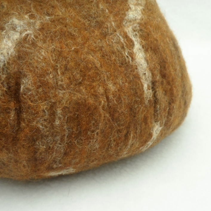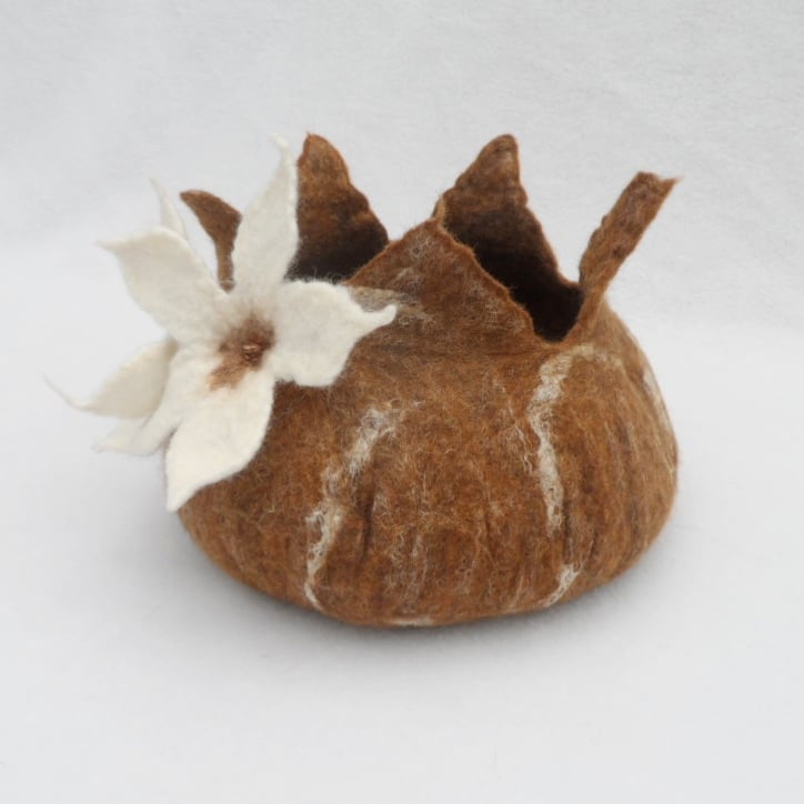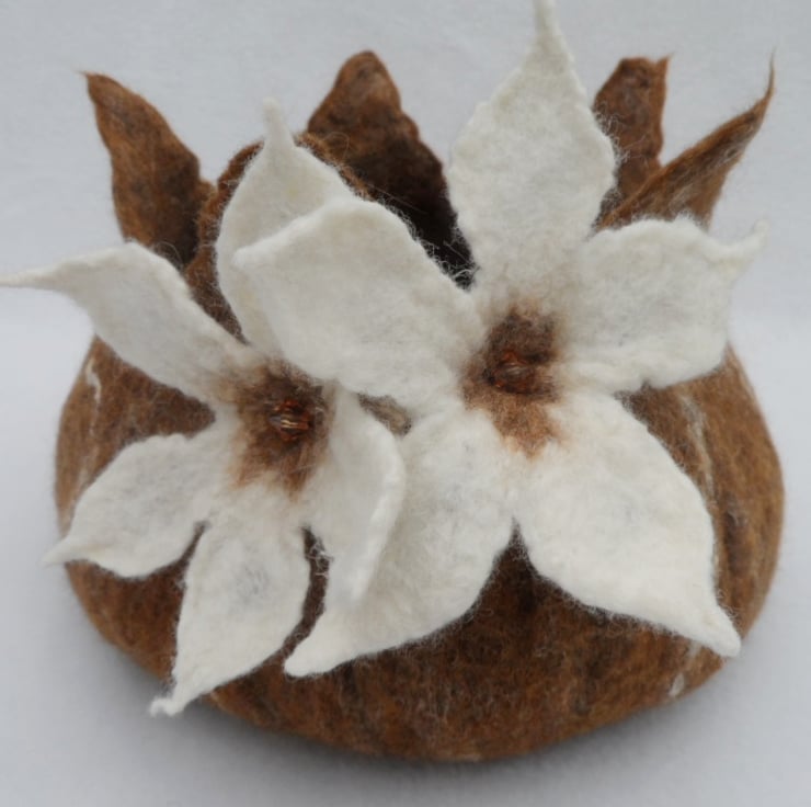 This hand felted bowl has been made using brown shades of merino wool blended with silk fibres. It has been decorated with further white silk fibres and two white flowers with beaded centres. It measures approximately 8"(20cm) in diameter and stands approximately 6"(15cm) high. The top has been shaped in a "star" formation.