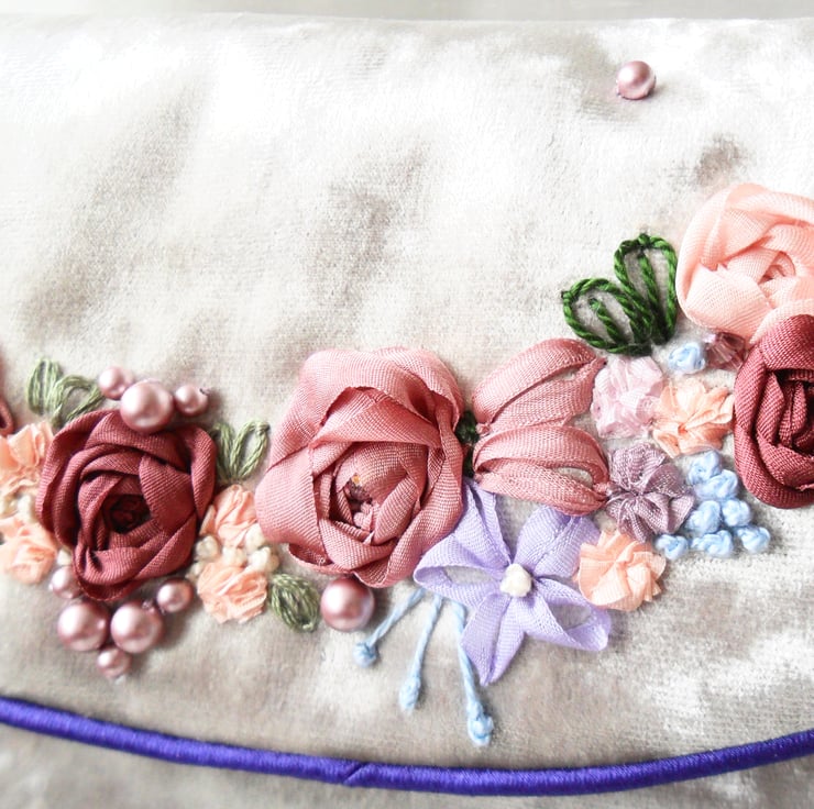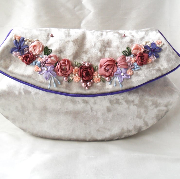 Handmade in a wonderfully tactile upholstery weight silver crushed velour this bag is perfect for any special occasion. The bag flap is edged with purple satin piping and is lavishly decorated with hand embroidered silk ribbon flowers in hues of lilac, purple and pink; cotton perle embroidery and Swarovski pearls and crystals. Lined in the purple satin, there is a slip pocket for your phone or mirror. The bag has a short chain handle, in a gunmetal colour, which can be removed or tucked inside if not required and the flap fastens with a magnetic catch.
