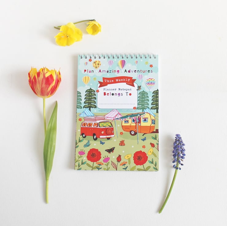 A5 (148x210mm) spiral bound 30 page notepad with weeky planner / journal pages inside (15 printed pages). Each page is printed with a weekly planner one side and a blank page on the other side for notes, doodles, dreams and ideas.
