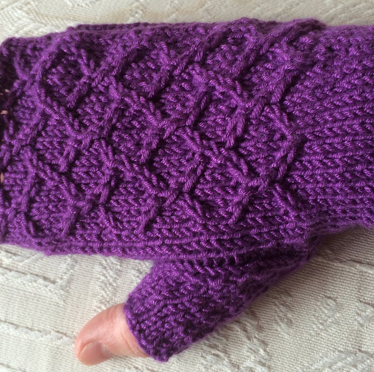 These silky, purple mitts are elegant, yet practical. With a diamond pattern on the back and a smooth palm, they are made from a bamboo and wool blend, providing warmth, elasticity and silkiness.