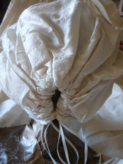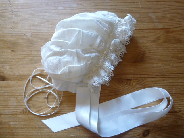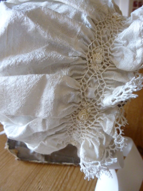 The Dupion silk fabric used for the bonnet has a slightly slubby texture in the weave.