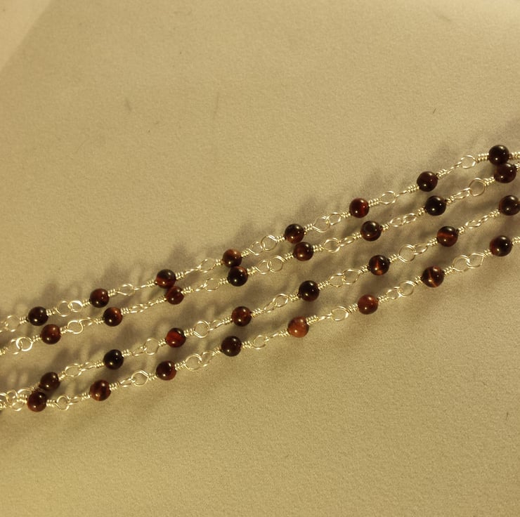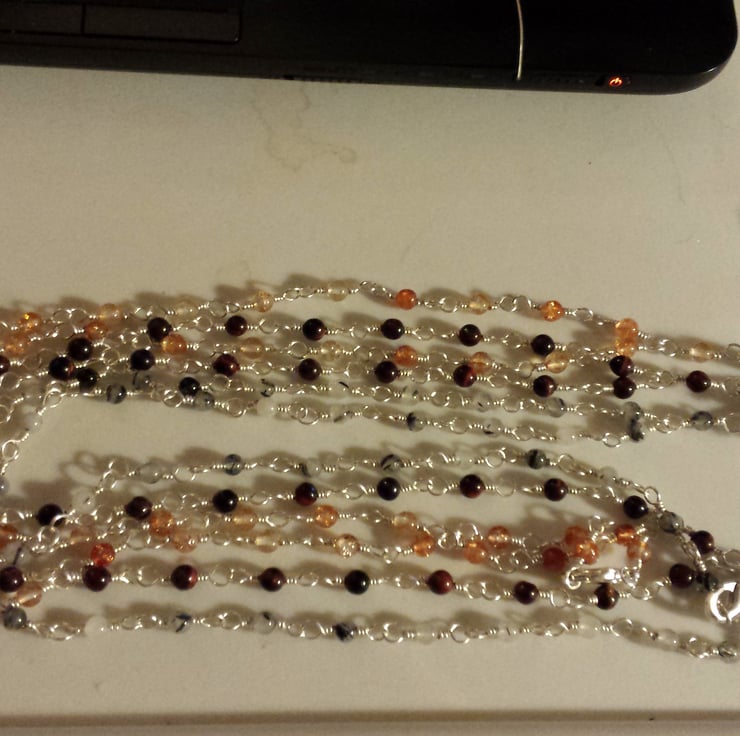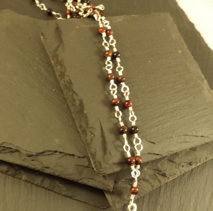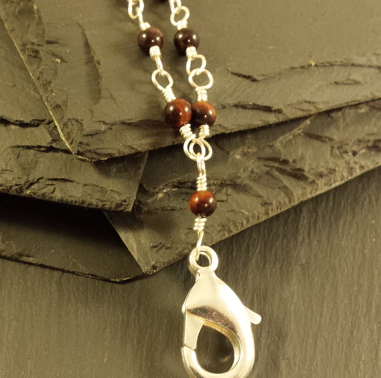 Who needs a boring cord/ribbon laynard when you can have a genuine gemstone one! Made with 4mm red tigers eye beads and silver plated copper wire. I've put a huge (2.4cm) silver plated lobster clasp to attach a pass to. I wear one of these to work every day and it easily fits the plastic holder for my pass. I find it much lighter than a classic lanyard and weighs less. The total length is 80cm/31.5in. There is a smaller lobster clasp at the back, it easily fits straight over your head but some do prefer to undo it. Of course it is also suitable to put a pendant on the clasp, or a watch fob.