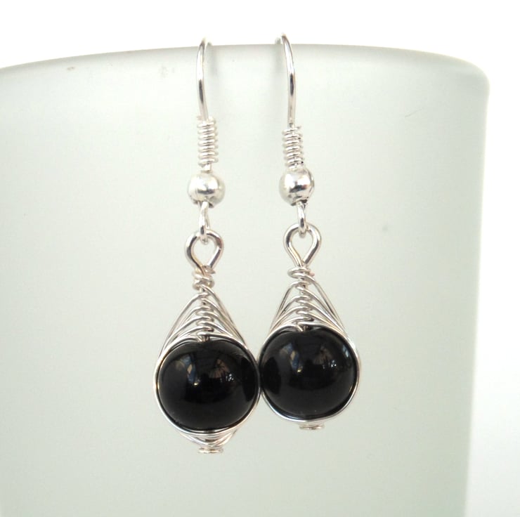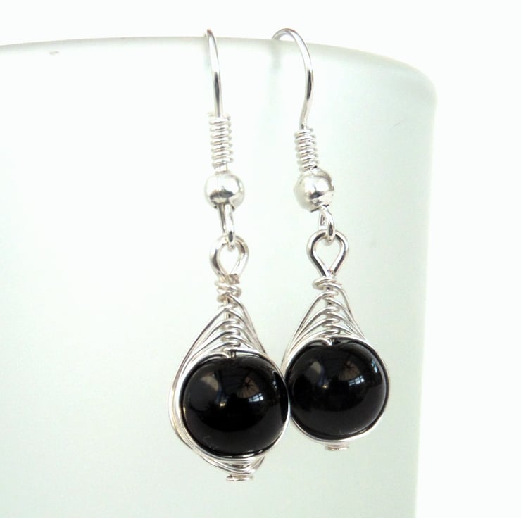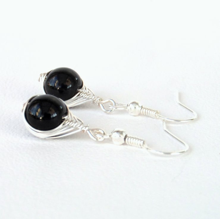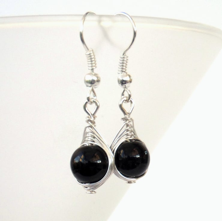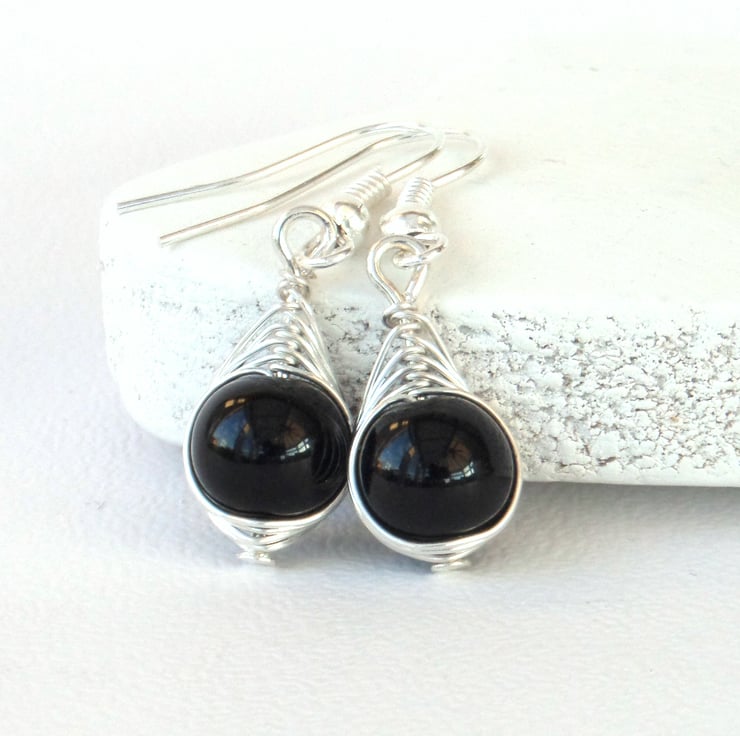An elegant pair of earrings, created with black onyx beads wrapped with anti-tarnish silver coloured wire.