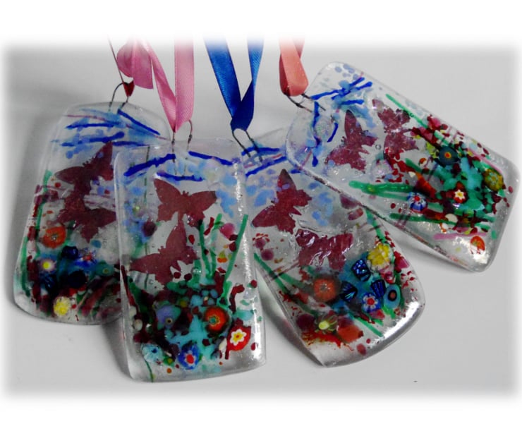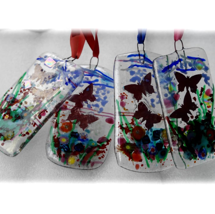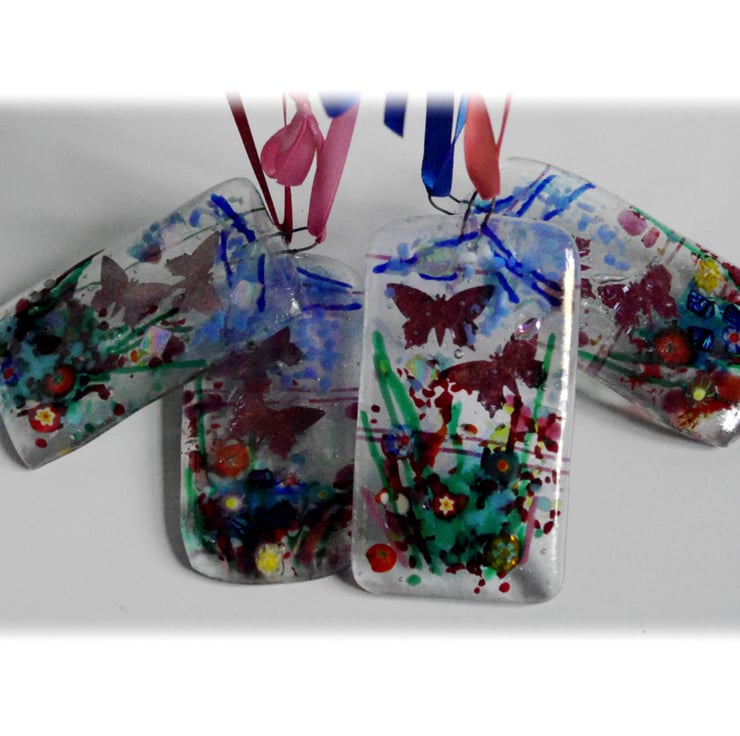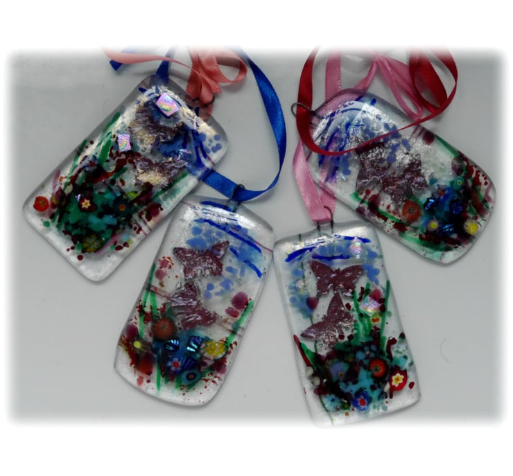 These are hanging decorations showing 2 little copper coloured butterflies above a flowery garden and under a blue sky. There are a few little dichroic spots of rain as those flowers need watering.