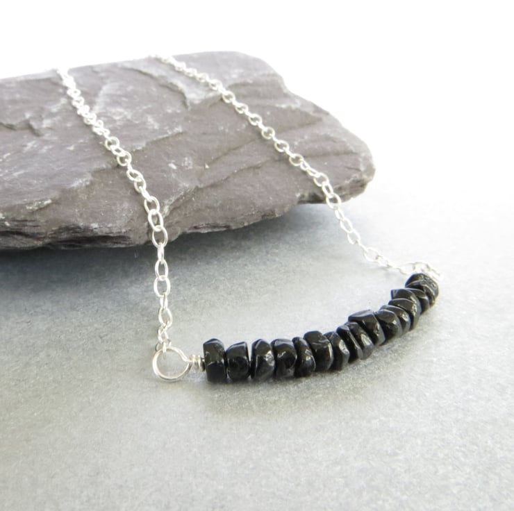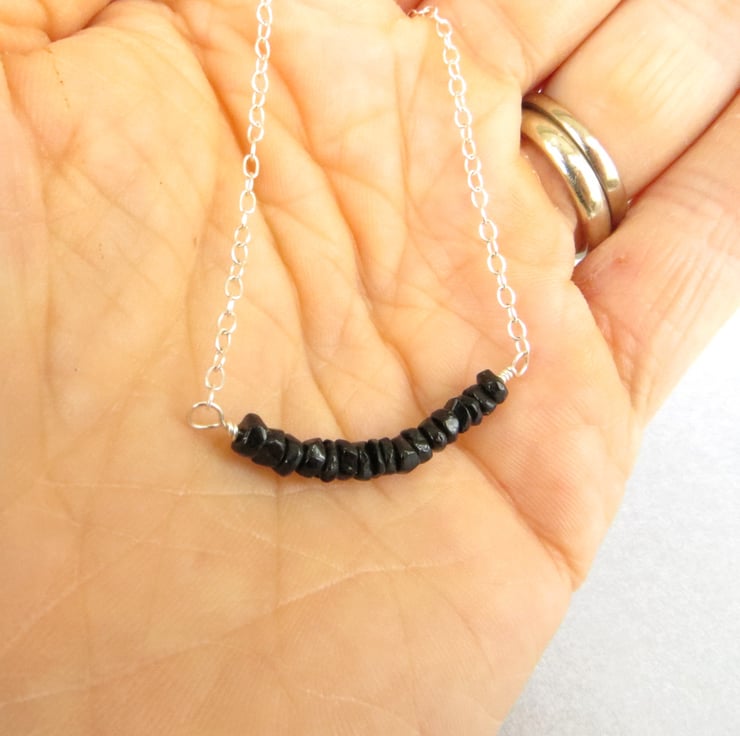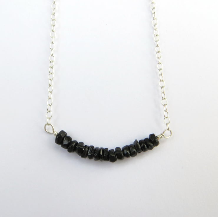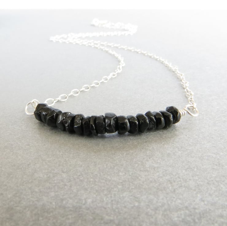 It features a row of hand faceted black tourmaline gemstones, set on a sterling silver wire with sterling chain at either side. The bar pendant shape is very popular right now, it's very dainty and can be worn with everything.