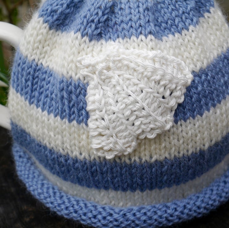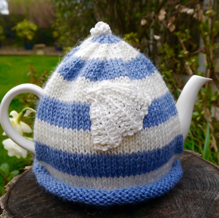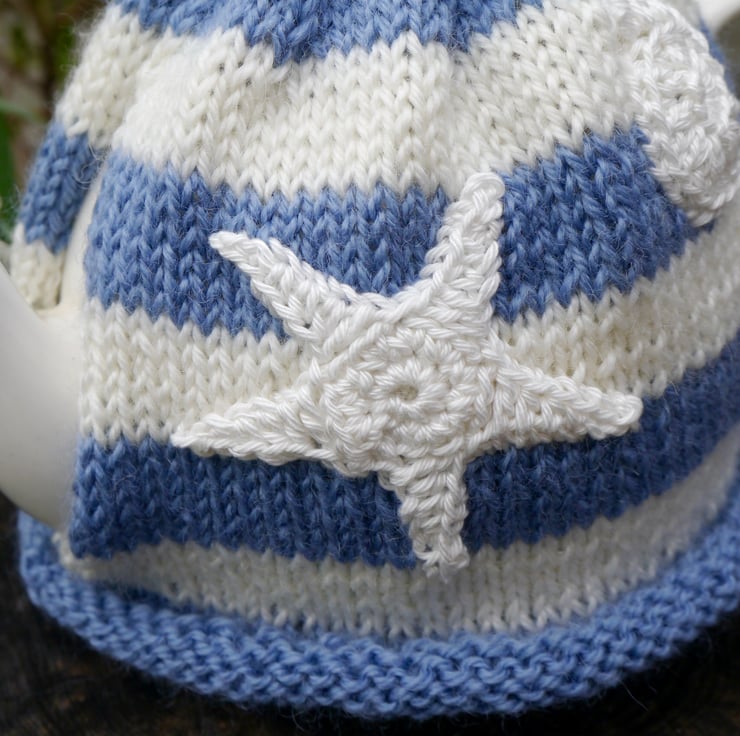 A hand knitted blue and cream striped tea cosy with a beach theme. I have crocheted cream shells using cotton yarn and attached them to the cosy. The tea cosy will fit a standard 4-6 cup teapot and is made using lovely warm aran yarn.