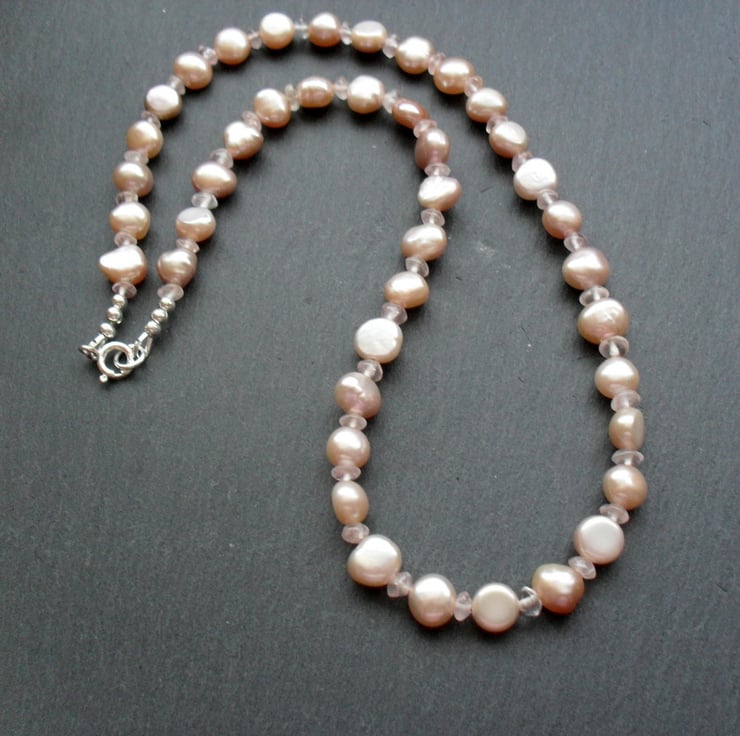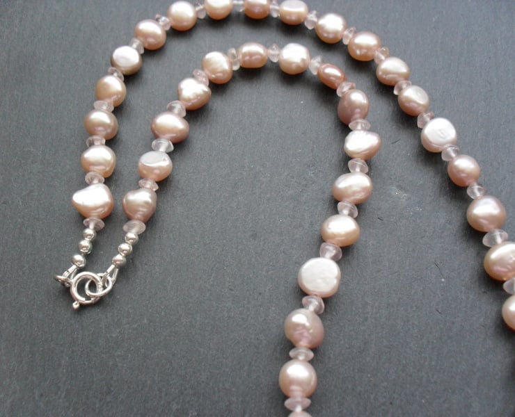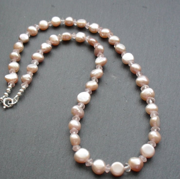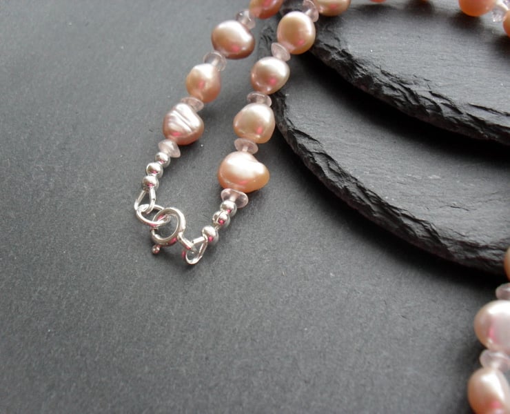 Freshwater cultured barque pearls in a pale dusky pink colour with rose quartz semi precious gemstones are beaded with beading wire and are attached to a sterling silver bolt ring clasp