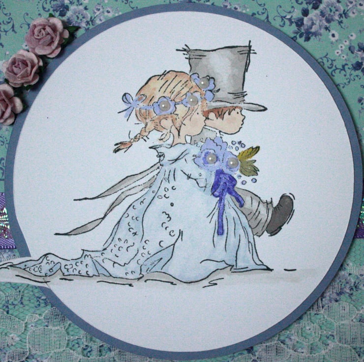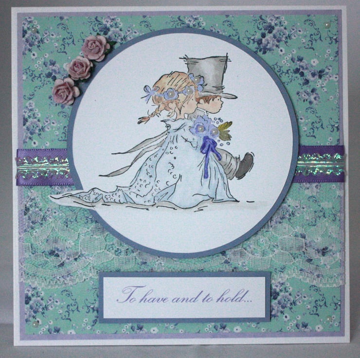Square, white, linen effect card featuring a hand stamped image of a cute bride and groom. The image has been coloured using Promarkers and finished with faux pearls. The image is layered onto pretty floral paper and lilac card with white lace, purple satin ribbon and frilly irridescent ribbon.