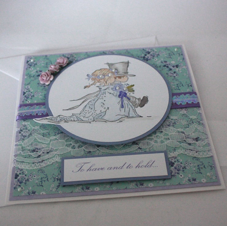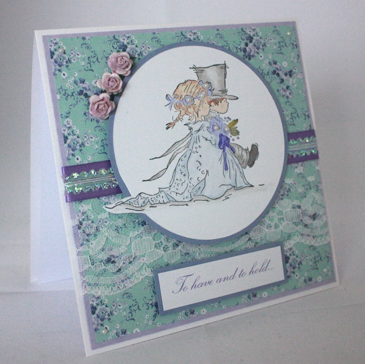 The message reads:' To have and to hold...' The front of the card is finished with faux pearls in each corner and three lilac paper flowers.