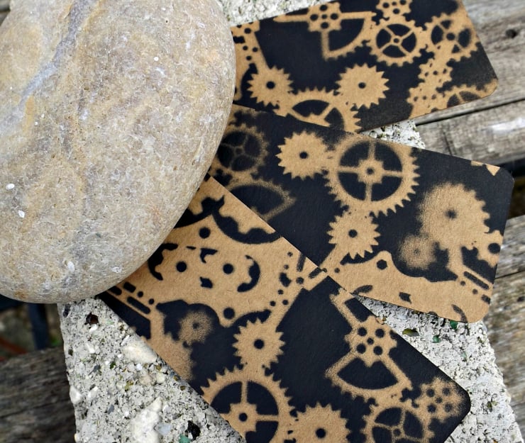 Stencilled steam-punk cog and gears design on a heavy kraft board. Each piece has a different orientation and arrangement.