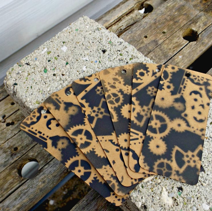 A collection of 6 hand printed steam-punk gift tags.