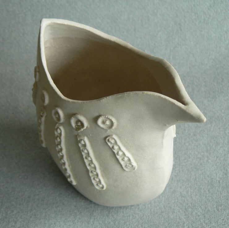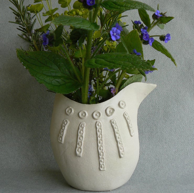 This is a new larger size with more impact than the previous vases. This vase has impressed raised detail made with found objects, glazed on the outside with white and inside with a shiny clear glaze.